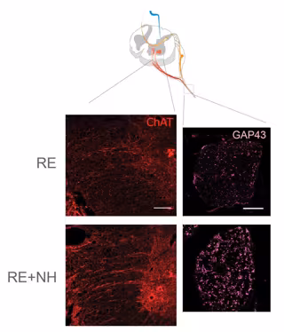 Asimismo, acelera la regeneración nerviosa, reduciendo de forma importante la atrofia del músculo al que se la han extraído las raíces nerviosas, y aumenta los contactos funcionales entre el nervio y el músculo afectado.