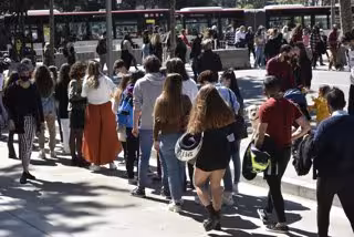 Colas en la plaza de Catalunya de Barcelona, donde se ha habilitado un espacio adaptado a las medidas sanitarias por el Covid-19 para paradas de libros y rosas por la Diada de Sant Jordi de 2021. - DAVID OLLER - BARCELONA
