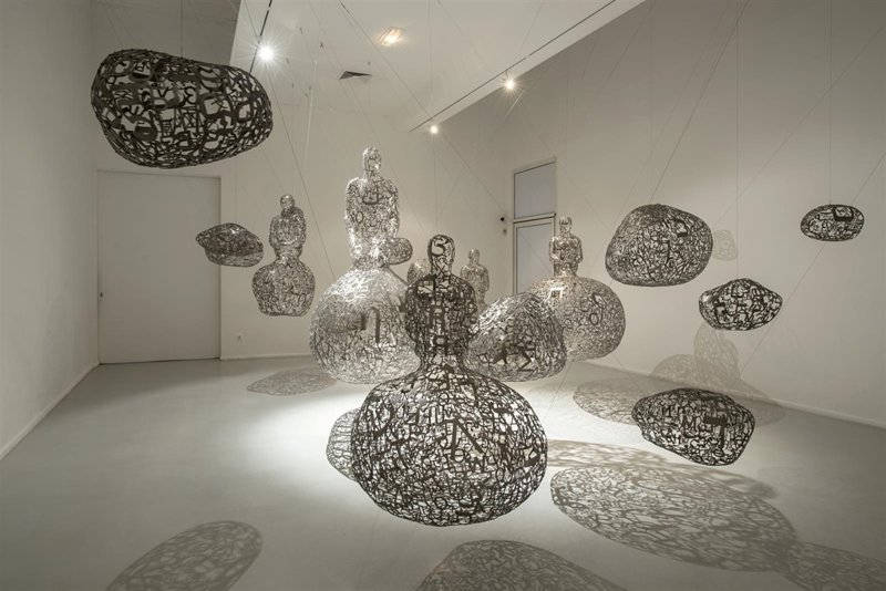 La segunda instalación es 'Talking continents', constituida por 19 elementos formados por letras de diferentes alfabetos, soldadas entre sí y formando piedras transparentes sobre las que se sientan siluetas humanas, y que simboliza un diálogo mudo entre planetas.