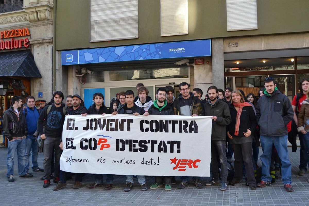 Una treintena de militantes de la juventudes de ERC (JERC) se han concentrado este jueves frente a las puertas de la sede del PP catalán en Barcelona para protestar contra el "golpe de estado" perpetrado contra los estudiantes de Valencia.
