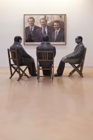 Preside la exposición la célebre fotografía del 'trío de las Azores', que el artista ha compuesto con los rostros los presidentes de todos los países que enviaron tropas a la guerra de Irak.