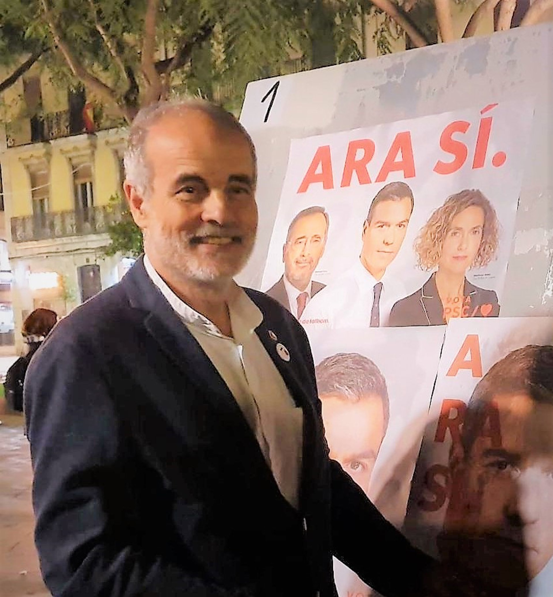 El candidato socialista al Congreso por Tarragona Joan Ruiz, en la pega de carteles de este jueves. - PSC