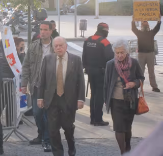 El matrimonio ha llegado en coche y ha entrado en el edificio por el acceso de Gran Via rodeado de un fuerte dispositivo policial de antidisturbios, donde han sido recibidos con bocinas, silbidos y gritos por parte de media docena de manifestantes, que han portado pancartas con lemas como 'Vagi-se'n a la merda família Pujol Ferrusola'.