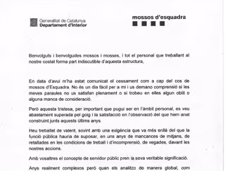 El hasta ahora mayor de los Mossos d'Esquadra, Josep Lluís Trapero, se ha despedido este sábado en una carta en la que ha pedido a todos los miembros del cuerpo "lealtad y comprensión" en las decisiones de los nuevos mandos.