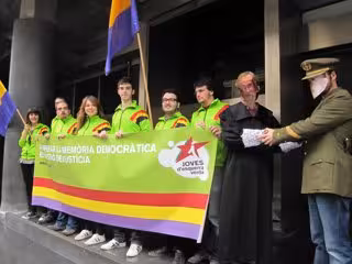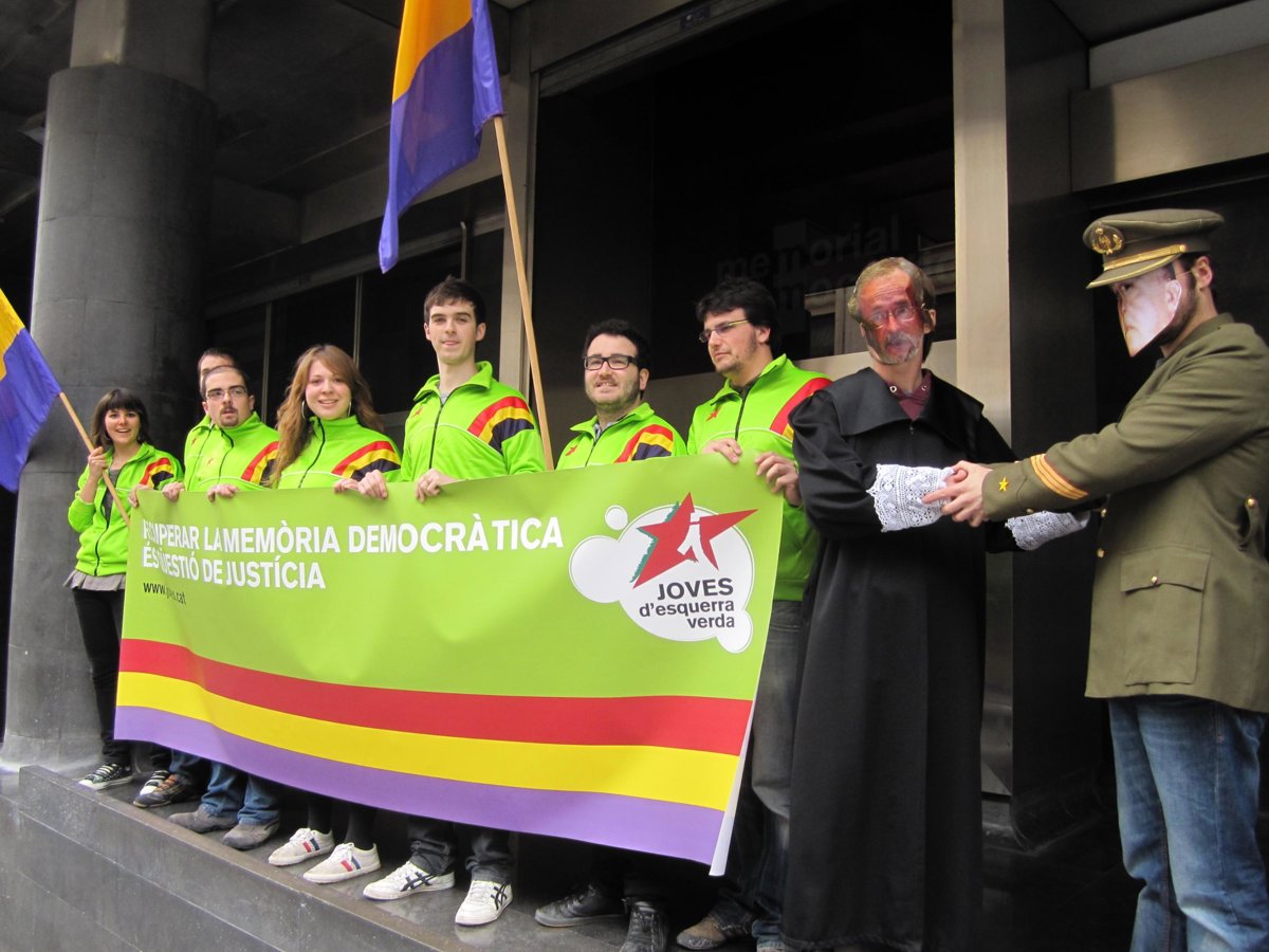 Joves d'Esquerra Verda (JEV), vinculada a ICV, criticó hoy la permanencia del franquismo en la justicia española con la recreación de un apretón de manos entre el dictador y el juez del Tribunal Supremo Luciano Varela durante la conmemoración del aniversario de la II República delante del Espai del Memorial Democràtic.