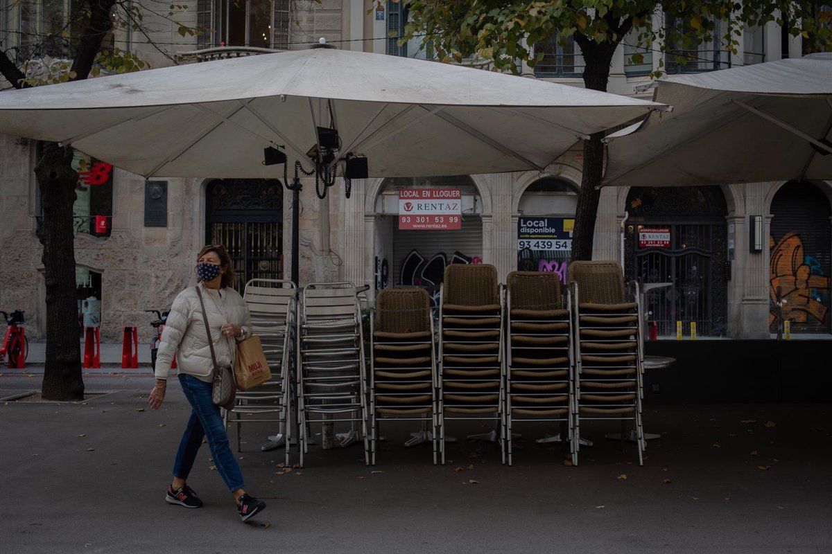 Una mujer pasa junto a la terraza recogida de un bar cerrado durante el cuarto día de la entrada en vigor de las nuevas restricciones en Cataluña, en Barcelona, Cataluña (España) a 20 de octubre de 2020. - David Zorrakino - Europa Press