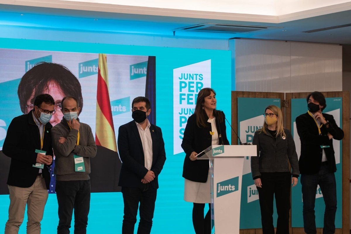 La candidata de Junts a las elecciones, Laura Borràs, con el expte.C.Puigdemont, el secretario general de Junts, J.Sànchez, la vicepresidenta, E.Artadi, y el exconseller J.Turull - EUROPA PRESS - LORENA SOPENA