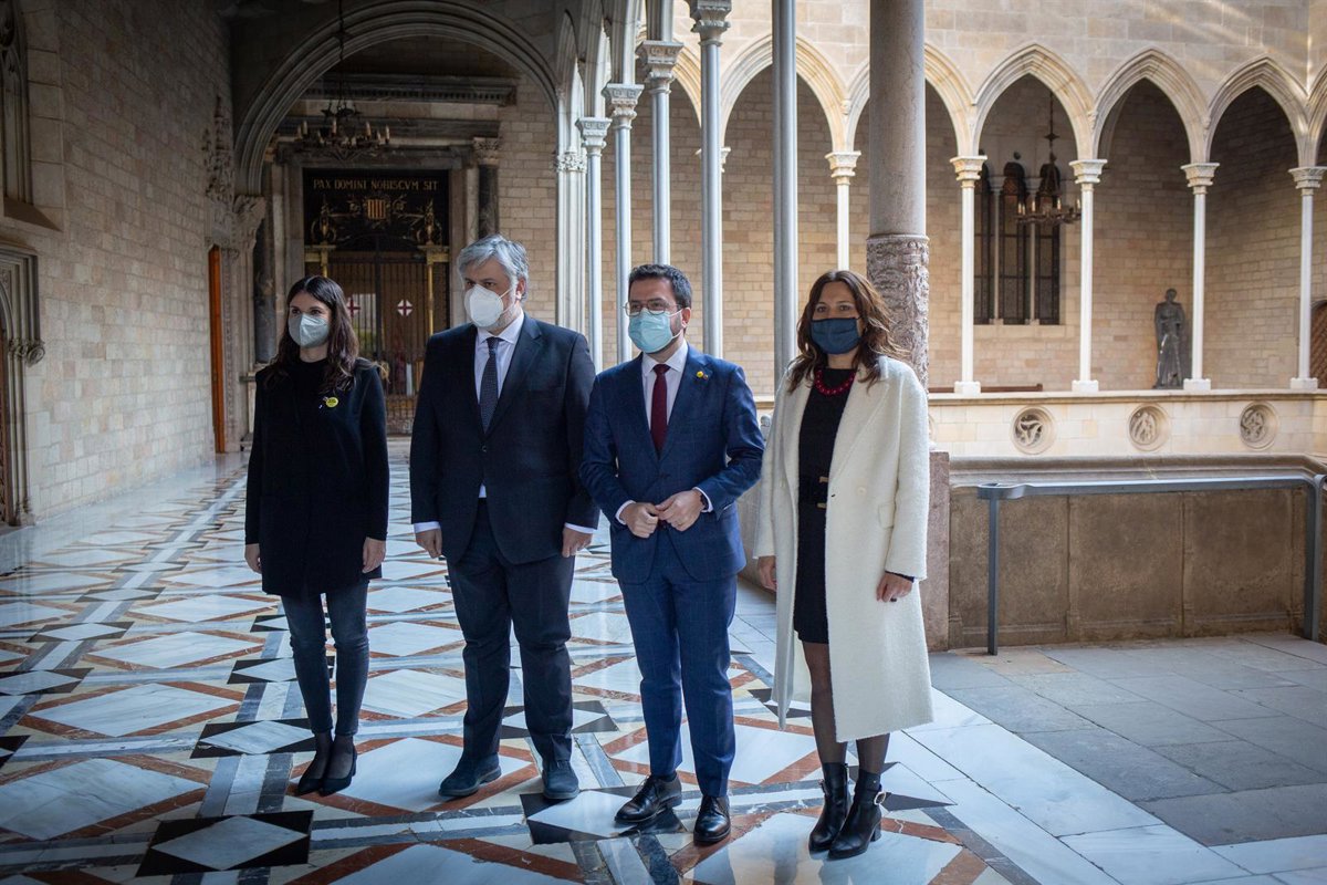 La portavoz de Junts en el Parlament, Mnica Sales; el presidente de Junts en el Parlament, Albert Batet; el presidente de la Generalitat, Pere Aragonés y la consellera de Presidencia, Laura Vilagr, posan a su llegada al Palau de la Generalitat - David Zorrakino - Europa Press