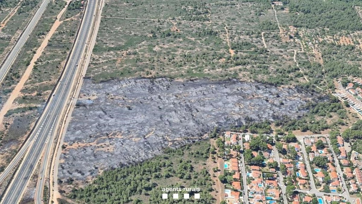 Según datos provisionales de Agents Rurals, el fuego ha afectado a unas 12,8 hectáreas: se ha iniciado en un solar por la quema de un tractor y ha cruzado la autovía A-7, que se mantiene cortada y sufre tres kilómetros de cola en ambos sentidos.