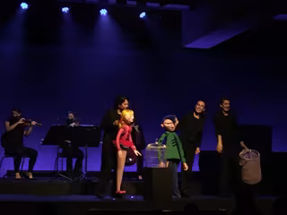 La puesta en escena aúna a la orquesta de jazz, formada por diez músicos del Conservatori, y tres intérpretes de marionetas que manipulan cerca de una decena de marionetas de tamaño natural y "muy coloristas".