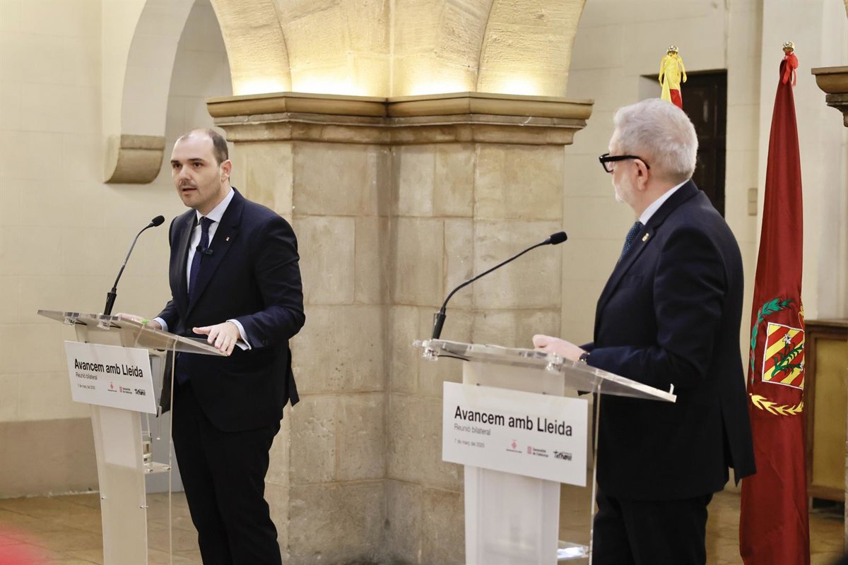 Archivo - El conseller de Presidencia de la Generalitat, Albert Dalmau, y el paer en cap de Lleida, Félix Larrosa, en una rueda de prensa tras la comisión bilateral Generalitat-Paeria - GOVERN - Archivo