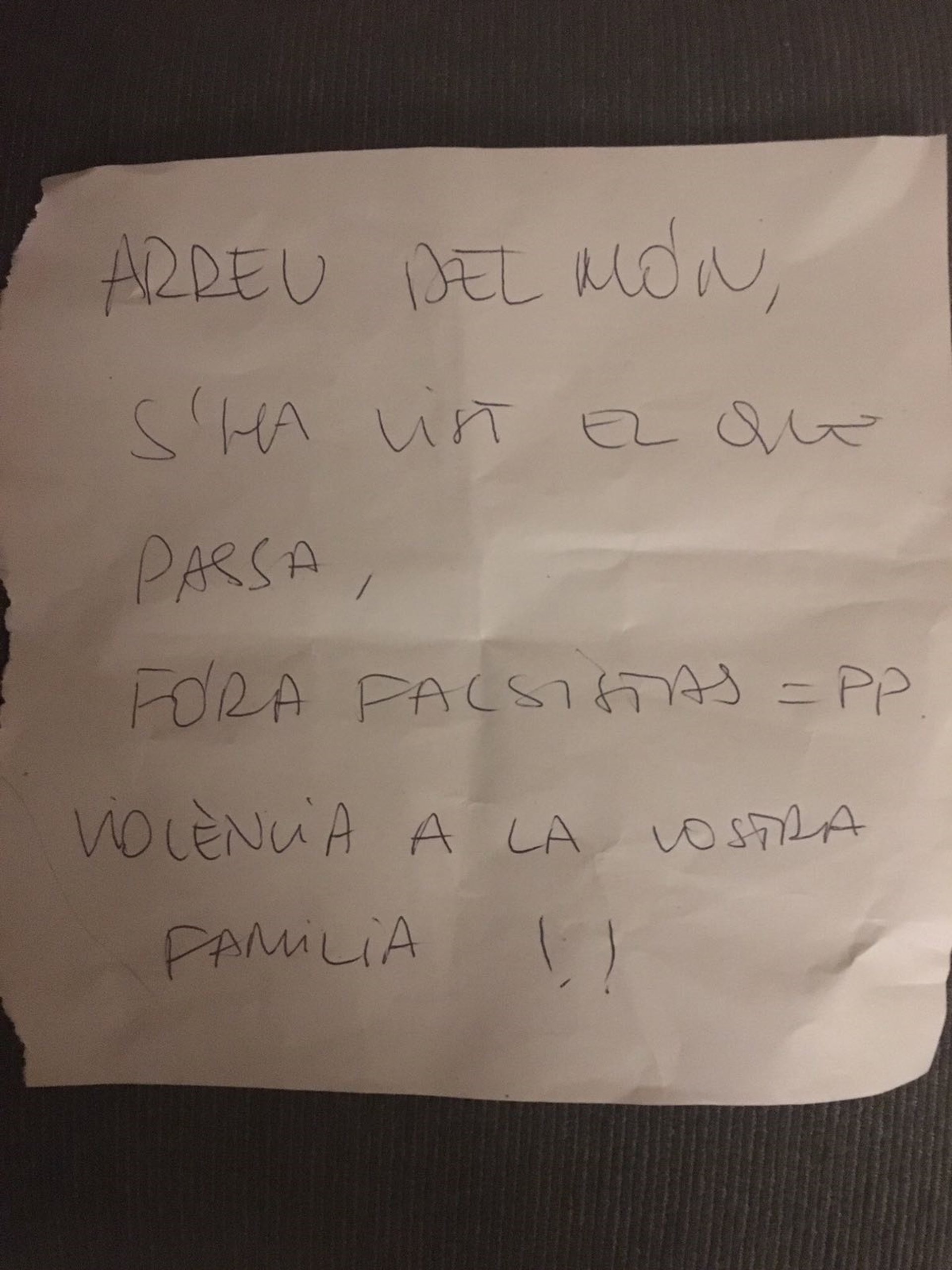 'En todo el mundo se ha visto lo que pasa. Fuera fascistas = PP. ¡¡Violencia en vuestra familia!!', dice un papel aparecido sobre el espacio donde ella tiene el buzón: "Lo ha dejado alguien que conoce mi domicilio".