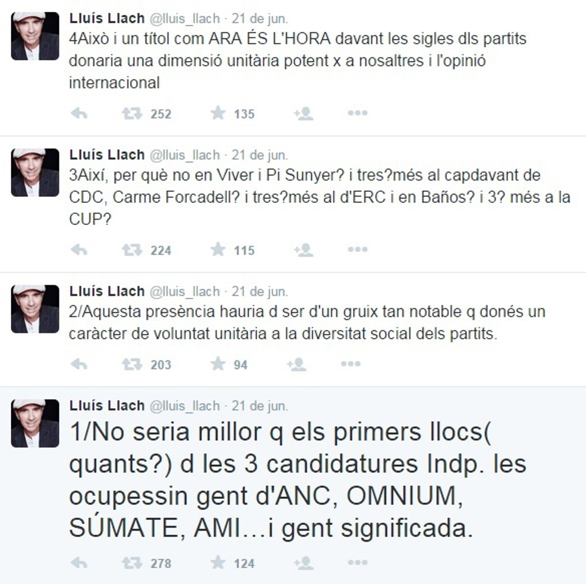 En seis apuntes en su Twitter, recogidos por Europa Press, Llach ha pedido que las tres listas compartan el título 'Ara és l'hora' por delante de las siglas de sus partidos para "dar una dimensión unitaria potente" ante la sociedad catalana y la opinión internacional.