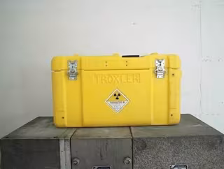 Se trata de una maleta de color amarillo, de 80x50x50 centímetros aproximadamente, con un asa metálica en la parte superior y una pantalla de cristal con un teclado numérico y un tubo metálico donde se aloja una de estas fuentes radiactivas.
