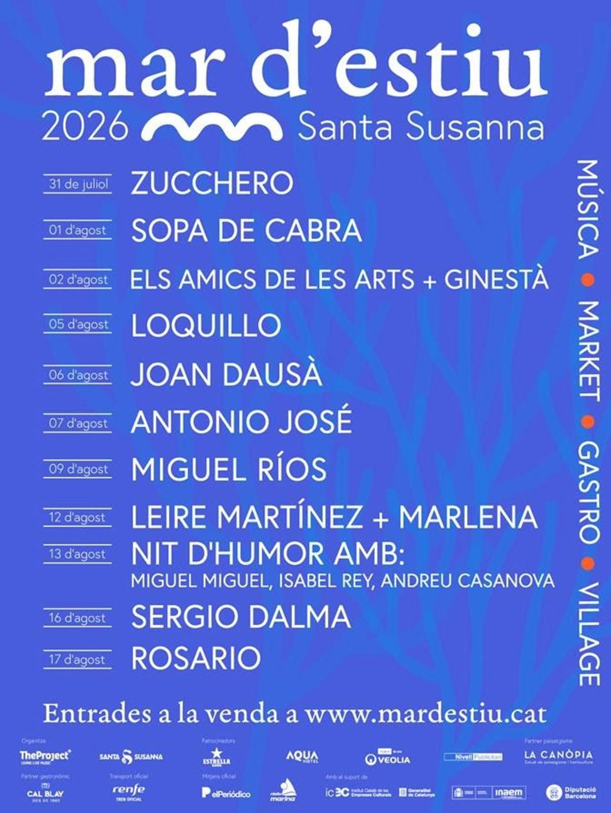 El festival Mar d'Estiu de Santa Susanna (Barcelona), que se celebrará entre el 31 de julio y el 17 de agosto, tendrá a Loquillo Sergio Dalma y Rosario, entre otros, informan los organizadores en un comunicado.