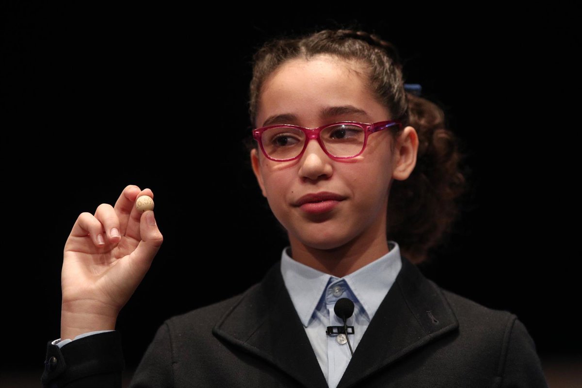 Una de las niñas de la residencia de San Ildefonso, Noura Akrouh , posa con la bola del número premiado con el Primer Premio de la Lotería de Navidad, el Gordo de la Lotería, el n 26.590. - Eduardo Parra - Europa Press
