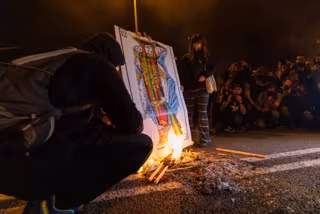Manifestantes queman fotos del Rey y banderas españolas en la Diagonal en la protesta por el acto de la FPdGi en el Palau de Congressos de Catalunya con la Familia Real - PAU VENTEO - EUROPA PRESS