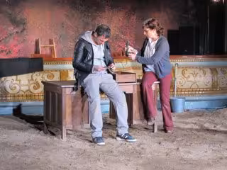 El equipo de La Perla 29, con sede en la Biblioteca de Catalunya, sólo ha tenido que cruzar la acera de la calle Hospital para trasladarse al Romea, y se han llevado consigo la arena característica en muchas de sus obras y el gusto por la cercanía del público, ya que el teatro se ha reestructurado para la ocasión para que el escenario quede en medio y haya butacas a lado y lado.