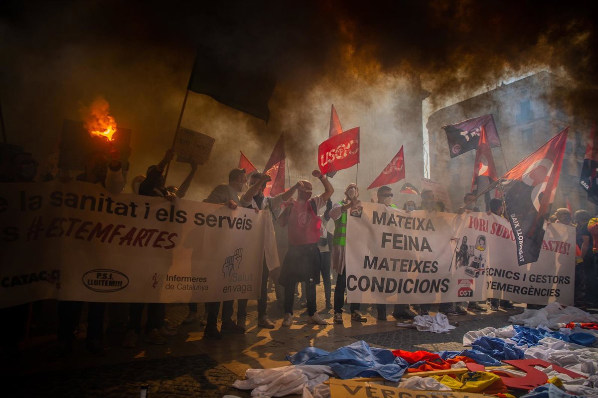 En la plaza de la capital catalana se han reunido manifestantes de distintos brazos de la huelga impulsada por los sindicatos USOC, Infermeres de Catalunya, CATAC-CTS-IAC, PSI Lluitem, COS y CGT, que el miembro de CATAC-CTS-IAC Xavier Tarragó ha calificado de "histórica" por la convocatoria de diferentes actores del sector.