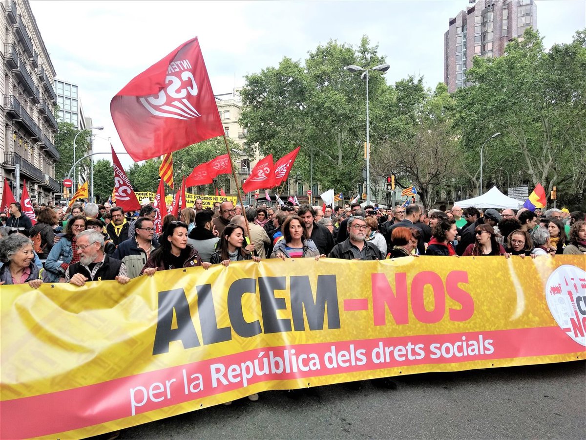 Con el lema de cabecera 'Alcem-nos per la República dels drets socials', la manifestación se ha iniciado a las 17.30 en la plaza Urquinaona, ha recorrido la Via Laietana y ha llegado sobre las 19 horas a la plaza Sant Jaume, donde representantes de las entidades convocantes se han dirigido a los asistentes.