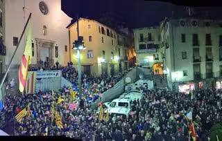 Más de 700 personas se han concentrado a las 19.00 horas de este viernes en la plaza Sant Pere de Berga (Barcelona) para apoyar a la alcaldesa del municipio, Montse Venturós (CUP), que este mismo viernes ha sido detenida por no haber respondido a los requerimientos del juez a causa de no haber retirado la 'estelada' del Ayuntamiento en periodo electoral.