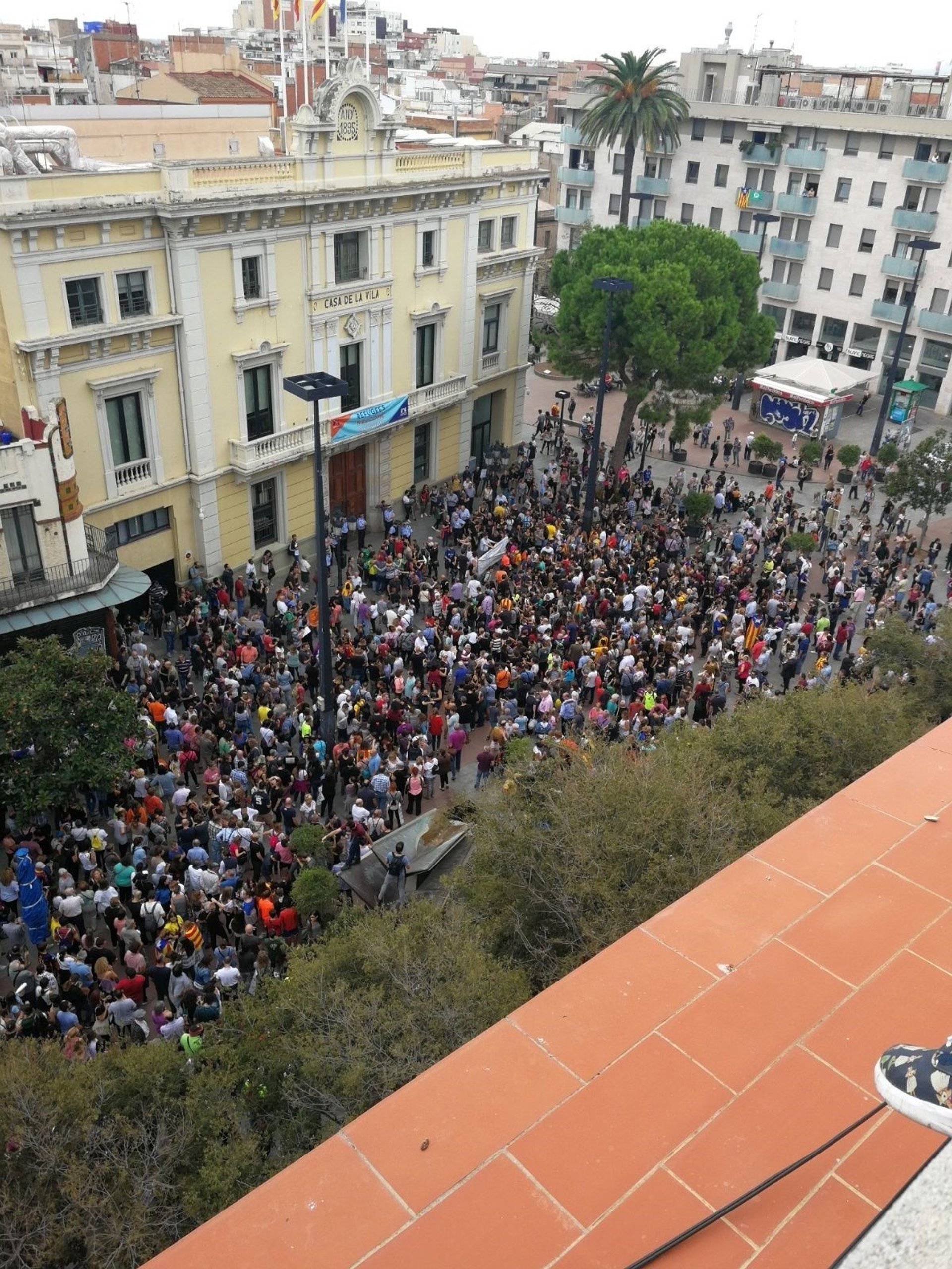 Centenares de personas han ido llenando la plaza del Ajuntament de L'Hospitalet en protesta contra las cargas policiales y han cantado 'Els Segadors' y 'L'Estaca'.