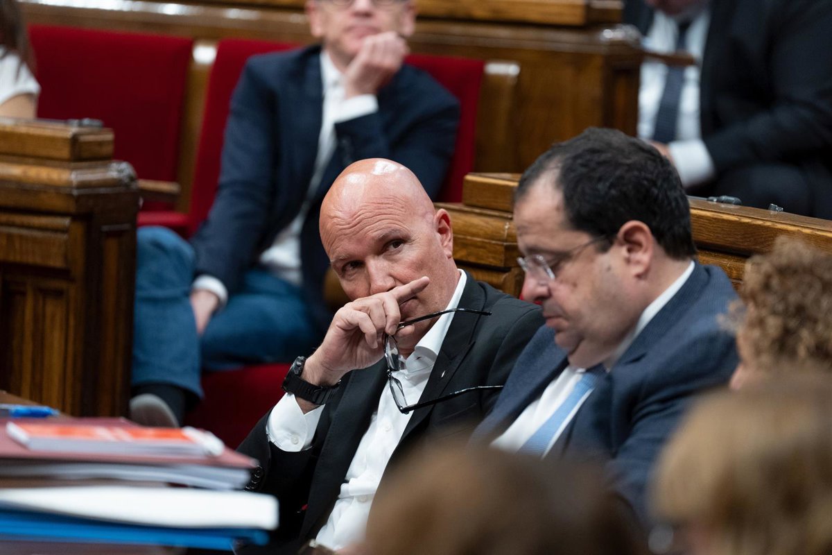 El nuevo conseller de Acción Climática, Alimentación y Agenda Rural, David Mascort i Subiranas (i) y el conseller de Interior, Joan Ignasi Elena (d), interviene durante una sesión plenaria en el Parlament de Catalunya, a 14 de junio de 2023, en Barcelon - David Zorrakino - Europa Press