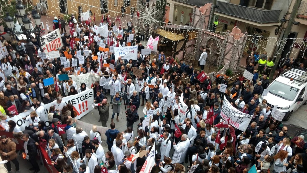 Lo han hecho en una manifestación que se ha celebrado en Terrassa, convocada por el sindicato mayoritario Metges de Catalunya (MC) --este viernes mantiene la huelga en el sector concertado-- y que ha congregado a unas 500 personas, según la organización.
