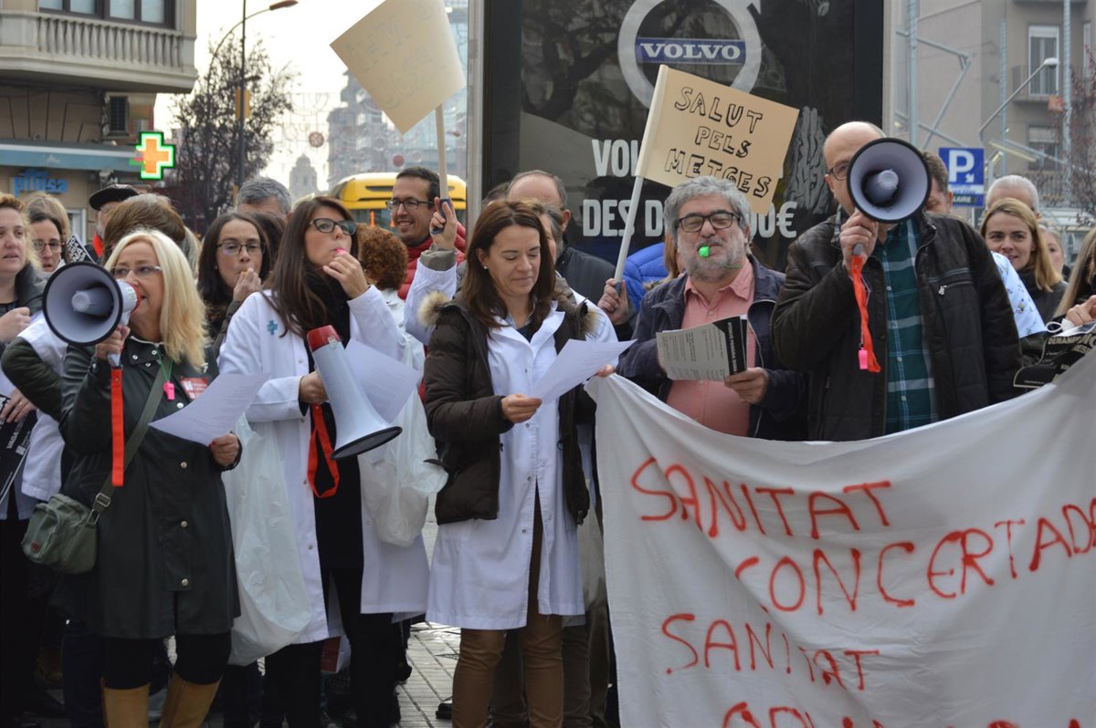 Un centenar de médicos y otros profesionales de la sanidad se han concentrado en la puerta de los servicios territoriales de la Generalitat y han recorrido plaza Ricard Vinyes con pancartas en las que podía leerse 'Salud para los médicos', 'Salarios dignos' y 'Luchamos por la sanidad pública'.