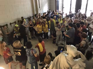 Medio centenar de personas han ocupado el vestíbulo de la Conselleria de Economía en la Rambla Catalunya de Barcelona convocados por el Sindicat de Llogaters para exigir a la Generalitat que pare la subasta de 47 inmuebles procedentes de herencias intestadas y los destine a vivienda pública de alquiler.