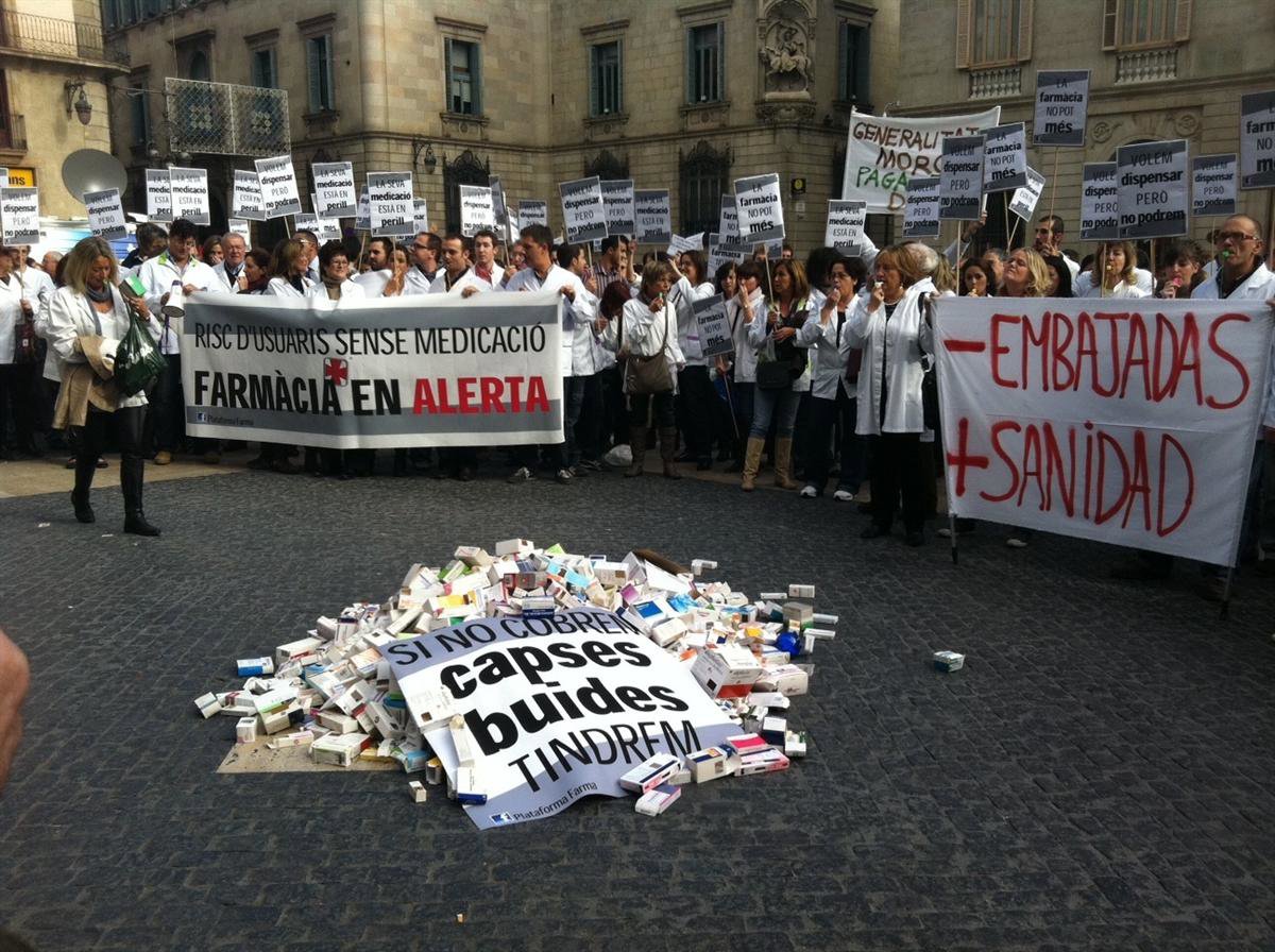 Medio millar de farmacéuticos de Barcelona se han manifestado este jueves en la plaza Sant Jaume contra los retrasos en los pagos que sufre el sector y que, según han explicado, provocarán el cierre del 20% de las farmacias catalanas --unas 600--.