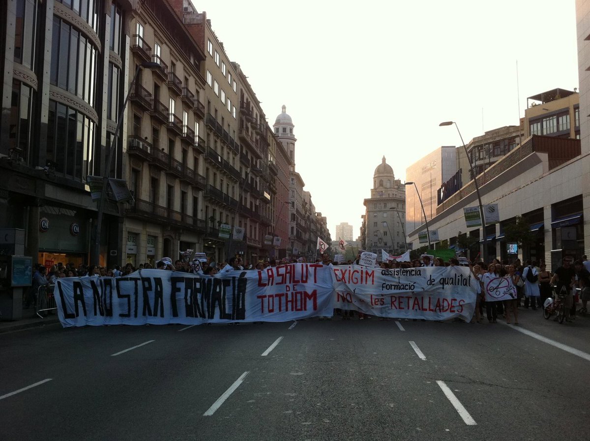 A las 9.40 horas, unos 400 sanitarios han cortado la Gran Via y la calle Balmes de Barcelona hasta las 12 horas contra el recorte salarial que tenía previsto negociar la Mesa Sectorial del ICS y que se ha suspendido por la irrupción de 200 trabajadores en el edificio.