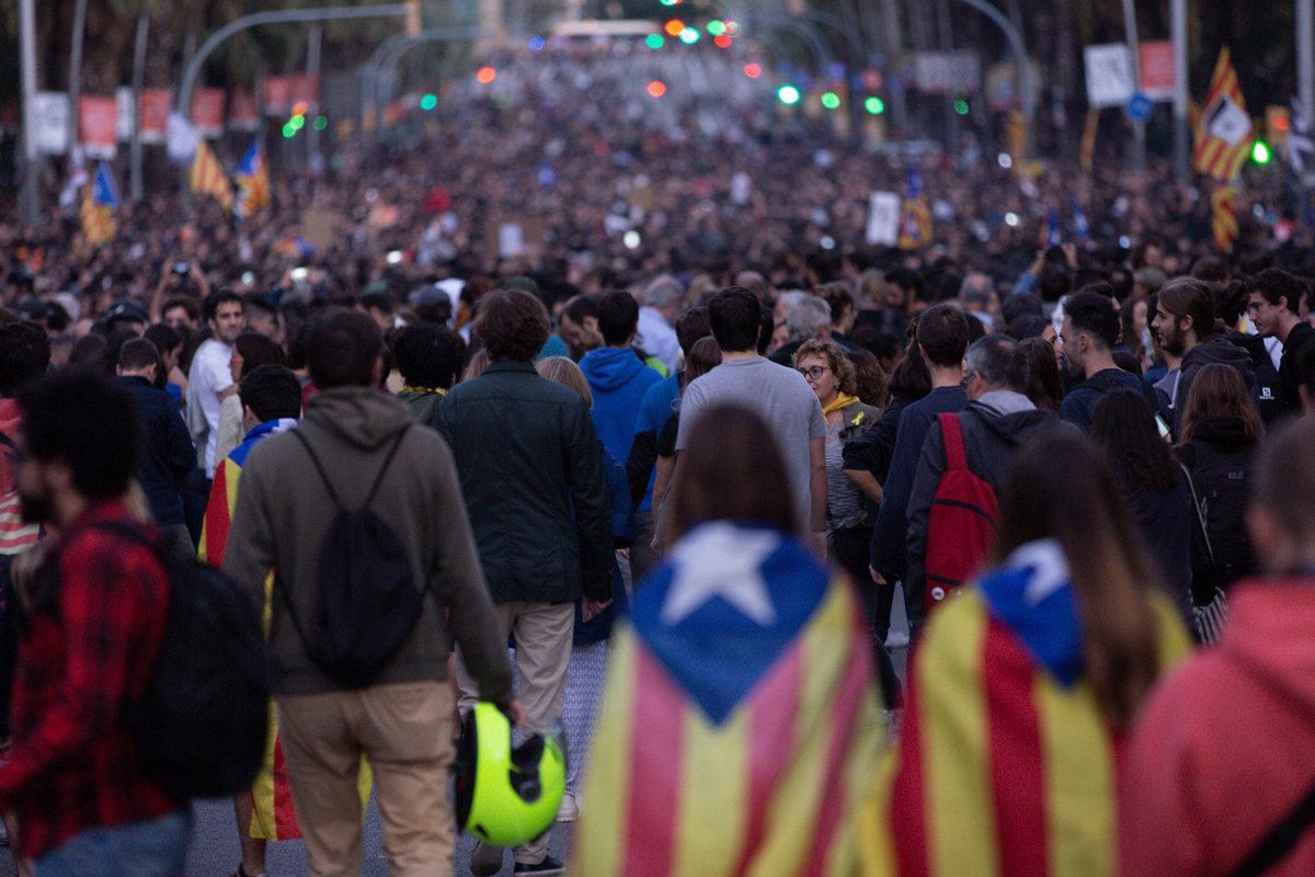 Los manifestantes se sitúan en la confluencia de la calle Gran Via con la calle Marina, ante la Monumental, cortando las calles, y claman consignas como: "Las calles serán siempre nuestras", "Libertad presos políticos" e "independencia".