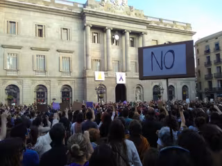 Miles de personas llenan la plaza Sant Jaume de Barcelona la tarde de este jueves desde minutos antes de las 19 horas, cuando se ha convocado una manifestación en protesta por la sentencia a los cinco miembros de 'La Manada', que han sido condenados a cárcel por abusos sexuales y no por delito de agresión: "No es abuso, es violación" y "No es no", han gritado los manifestantes.