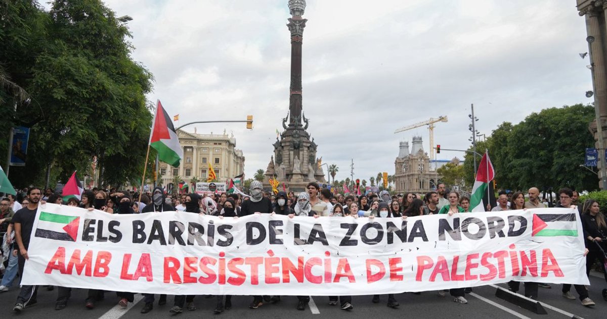 A esa hora, a los manifestantes concentrados en la plaza se ha unido una columna que portaba una pancarta con el mensaje "Els barris de la zona Nord amb la resistencia palestina" que ha llegado por el passeig Josep Carner, con la intención de entrar en la.