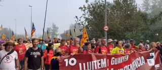 Las marchas están encabezadas por pancartas con los mensajes '1-O, lluitem y guayem la independncia' ('1-O, luchemos y ganemos la independencia') y 'Pasos Catalans lliures i sobirans' ('Países Catalanes libres y soberanos').