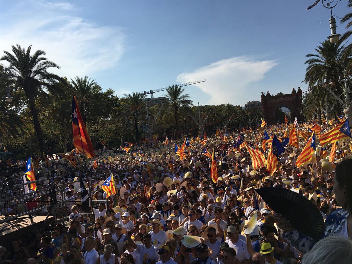 El momento culminante ha llegado cuando todos los manifestantes han levantado una cartulina circular y amarilla a modo de latido, y después han tomado la palabra las dos principales entidades soberanistas, la ANC y Òmnium, que han vuelto a reclamar un referéndum para concretar la independencia.