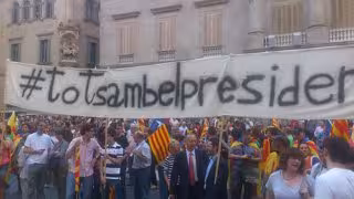 En el centro de la plaza, los manifestantes han exhibido una pancarta donde se leía 'Todos con el presidente' y multitud de 'esteladas', y han coreado proclamas a favor de la independencia de Catalunya.