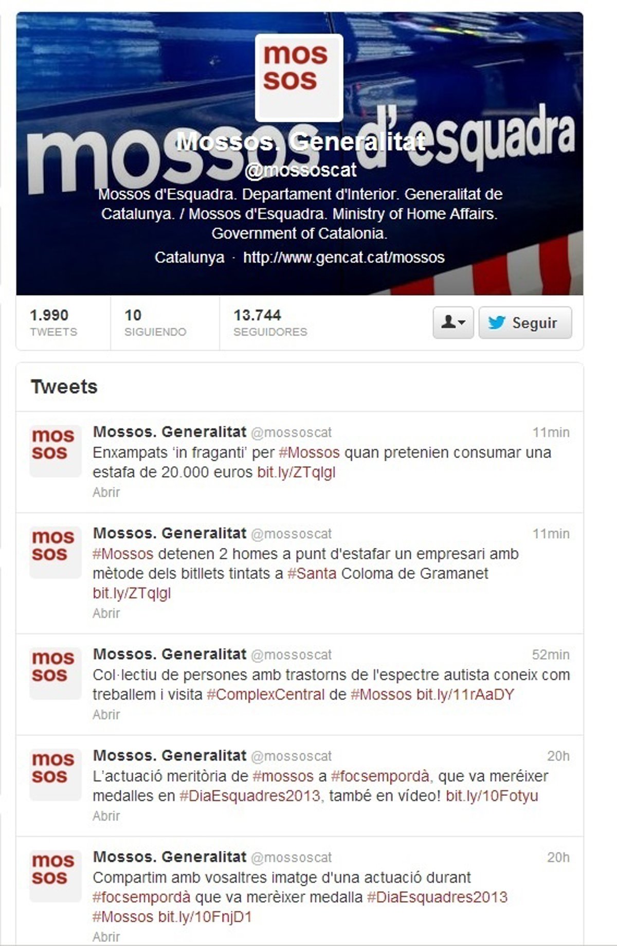 Según ha informado la policía catalana este sábado en un comunicado, la cuenta @mossoscat ha realizado en doce meses unos 2.000 tweets, una media de 250 mensuales, con los que se han comunicado operaciones especiales, consejos en seguridad, prevención y contenido corporativo sobre el cuerpo policial.