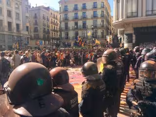 Los Mossos d'Esquadra han cargado este sábado a última hora de la mañana contra una parte de los manifestantes independentistas que se han enfrentado en Barcelona al cordón policial que les separa de la manifestación simultánea de policías nacionales de Jusapol, iniciada sobre las 12, la hora prevista.