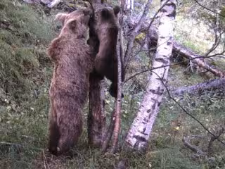 La fotografía muestra a un cachorro, acompañado de su madre, subiendo a uno de los árboles situados cerca de las cámaras, marcadas para atraer a los animales y facilitar el seguimiento por imágenes.