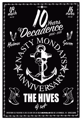 La fiesta de rock'n roll de Barcelona Nasty Mondays cumple una década y lo celebrará este lunes con la participación de la banda de rock sueca The Hives, ha anunciado este miércoles Nasty Garage en un comunicado.