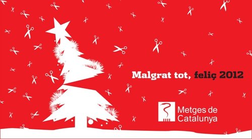 El sindicato Metges de Catalunya (MC) ha felicitado este año la Navidad recordando la disminución presupuestaria de 900 millones de euros aplicada en el presupuesto sanitario por la Genearalitat, con una postal en la que las tijeras símbolo de los recortes parten por la mitad un abeto.