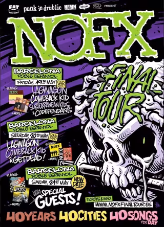 El grupo de punk rock californiano NOFX ha anunciado un tercer concierto en mayo en el Poble Espanyol de Barcelona en su 'Final Tour', con el que recorrerán 40 ciudades e interpretarán 40 canciones tras 40 años de carrera, ha informado la banda.