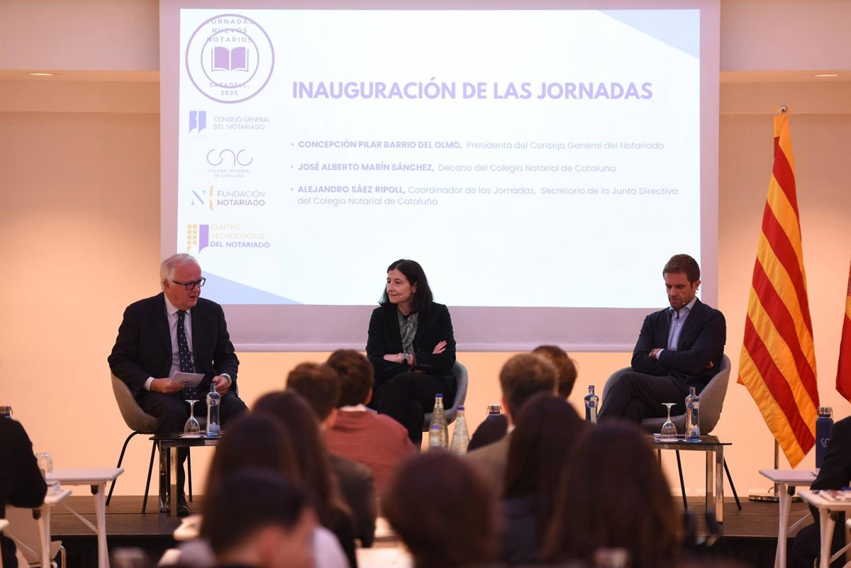 La presidenta del Consejo General del Notariado, Pilar Concepción Barrio del Olmo; el decano del Colegio Notarial de Catalunya, José Alberto Marín Sánchez, y el coordinador de las Jornadas y secretario de la Junta Directiva del Colegio Notarial de Catalunya, Alejandro Sáez Ripoll, han sido los encargados de inaugurar las jornadas.