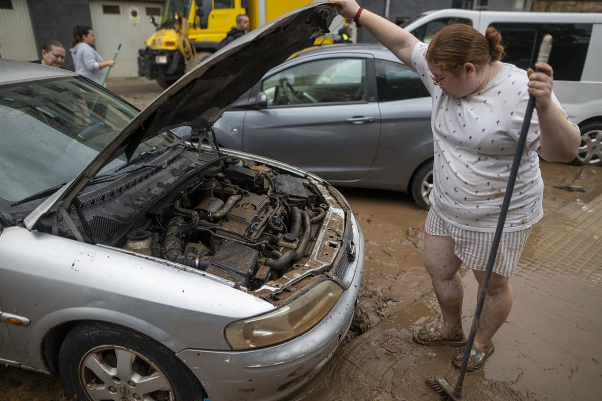 Una mujer observa el motor de un coche lleno de barro en La Ràpita (Tarragona) - Lorena Sopêna - Europa Press