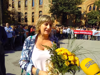 Más de 200 trabajadores del departamento y del Servei Català de la Salut (CatSalut) la han recibido sobre las 10.00 horas ante el edificio, en el recinto de la Maternitat de Barcelona, con aplausos y dos pancartas con los lemas 'Hola República' y 'Llibertat Presos Polítics', y le han entregado un ramo de rosas amarillas.