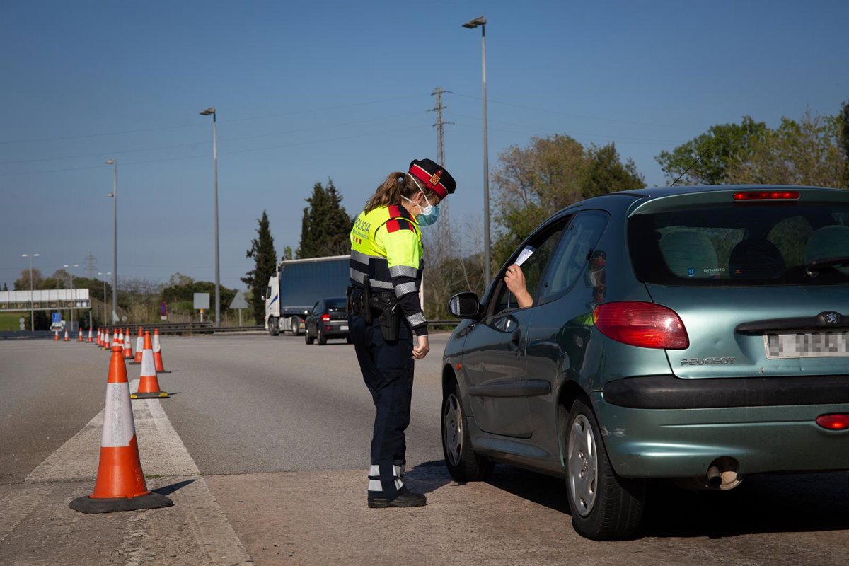 Una agente de los Mossos d'Esquadra protegida con una mascarilla en un control en el peaje de La Roca del Valls pide a un conductor el justificante que le permite su salida de casa, en La Roca del Valls/Barcelona/Catalunya (España) a 9 de abril de 202 - David Zorrakino - Europa Press