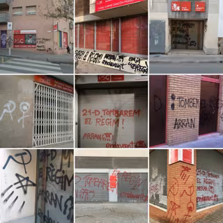 Estas pintadas están firmadas por Arran, la organización juvenil vinculada a la CUP, y Endavant, una de las corrientes de los 'cupaires', y hay lemas como '21D: Tumbemos el régimen', la 'estelada', la hoz y el martillo, y un símbolo feminista.
