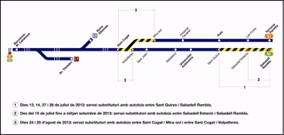 El servicio en el tramo entre Sant Quirze y Sabadell Rambla se cortará durante los fines de semana del 13 y 14 y 27 y 28 de julio, y a partir del 14 de julio y hasta mediados de septiembre se cortará el servicio entre las dos estaciones finales de Sabadell (Sabadell Estació y Sabadell Rambla).